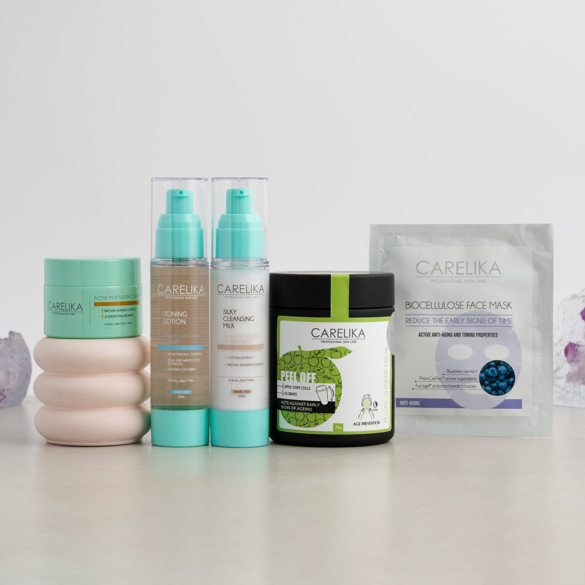 Thin lines, wrinkles, and pigmentation are signs of aging. Slow down your aging with a scientifically proven all-natural combination kit from Carelika enriched with apple stem cell extract to increase the longevity of your skin cells. The five-step beauty ritual includes a silky cleanser to clear skin impurities and a toner that helps restore and lock the natural moisture. Active moisturizing cream adds further moisture to your skin. Boost this up with two different and very effective face masks. The Shaker Peel off mask helps restore microcirculation, slow down aging and smoothen your wrinkles. The Biocellulose face mask has active antiaging and smoothening properties to assure a silky velvety feel.